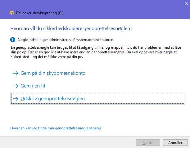 Trin 4: Gem eller udskriv genoprettelsesnøglen for krypteringen