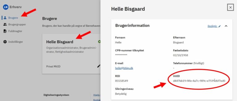 - Klik derefter på menupunktet “Brugere” og klik på din profil (f.eks. her på billedet er det “Helle Bisgaard”)