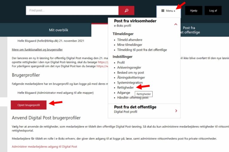 - Klik på menupunktet “Menu” og derefter på “Rettigheder“
