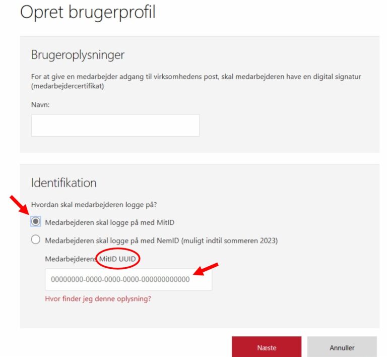 - Sæt din kopierede UUID-kode ind i feltet “Medarbejderens MitID UUID” (det er dén UUID-kode, som du kopierede fra dit MitID Erhverv)